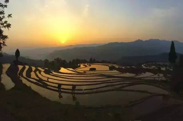 時(shí)下,接龍?zhí)萏镩g仍彌漫著春暖花開的暖意,嫩嫩的黃、泛綠的樹枝搭配和煦的陽(yáng)光與濕潤(rùn)的泥土,明媚俏麗。夕陽(yáng)西下,逆光下的梯田又有一番味道,朱熹筆下“半畝方塘一鑒開,天光云影共徘徊”的境界在這里得到完美呈現(xiàn)。