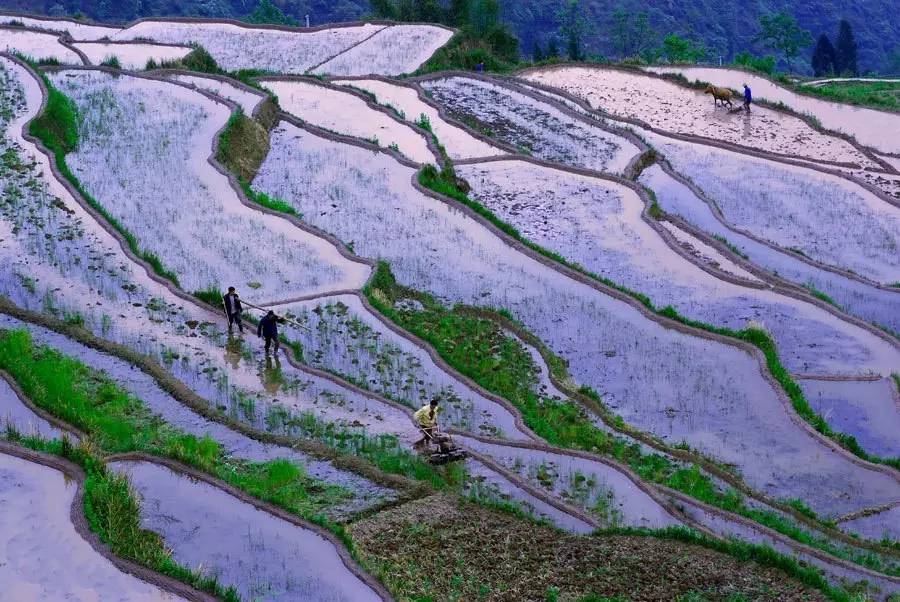放眼望去,宛如蛛絲一般的田埂,泛著銀光的水田面,戴著蓑笠的農(nóng)夫們犁田、砌埂、削壁、灌水,身影點(diǎn)綴在如鏡般的梯田水面上。這才是最天然的田園風(fēng)情!