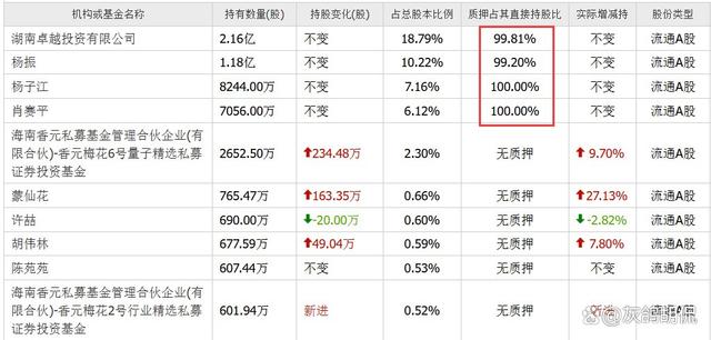 楊振是加加食品創(chuàng)始人,肖賽平是其配偶,楊子江是兩人的兒子,湖南卓越投資是三人共同持股的公司,合計持股42.29%,幾乎一股不剩,整體全質(zhì)押了。