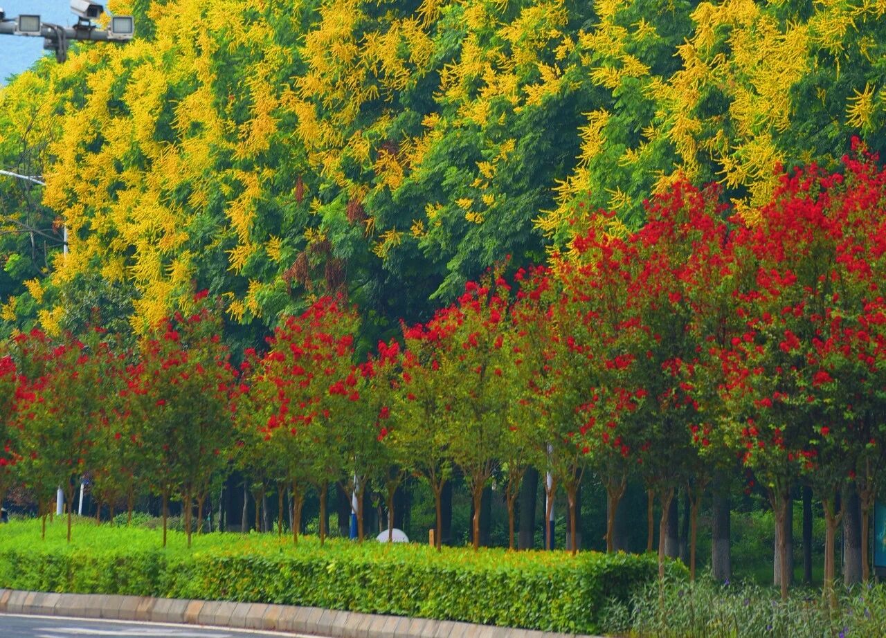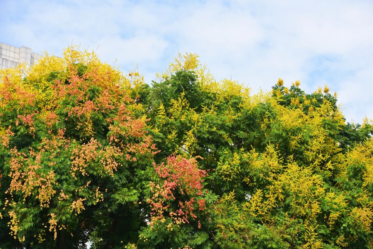 夏末轉(zhuǎn)初秋欒樹(shù)金黃色的花穗與漸次轉(zhuǎn)紅的蒴果交織在一起從鵝黃到嫣紅再到朱丹一步步繽紛秋日的色彩為城市增添幾分“層林盡染”的秋意