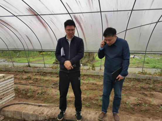 ▲ 工作隊副隊長葉林(左)和瓦屋村駐村第一書記胡杰(右)實地查看大棚建設(shè)情況。市委宣傳部幫扶集團(tuán)駐鄉(xiāng)工作隊供圖