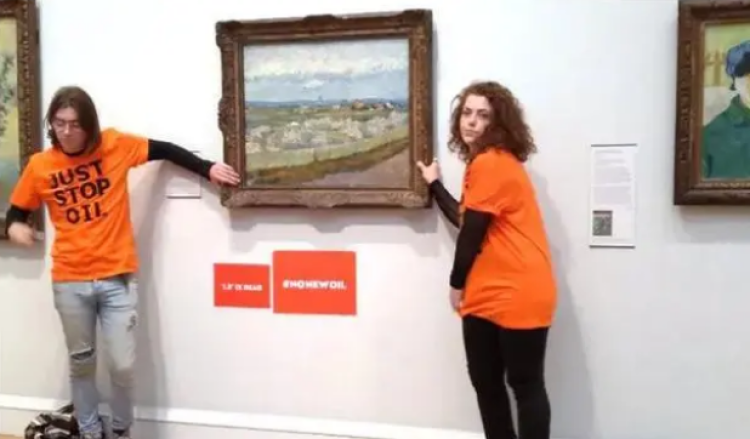 6月30日,兩名英國氣候變化抗議者進入倫敦一家畫廊,將手粘在梵高名畫《桃花源》(Peach Trees in Blossom)的畫框上,以抗議英政府的氣候政策。