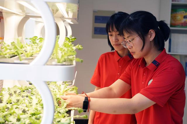 ↑在峪口鎮(zhèn)西樊各莊科技小院,駐村大學(xué)生朱思蓉(前)查看園藝種植機(jī)中苦菊的生長(zhǎng)狀況(5月17日攝)。