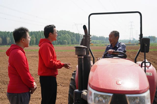 ↑在峪口鎮(zhèn)西樊各莊村,西樊各莊科技小院駐村大學(xué)生王萌(中)與陶閱兵(左)與當(dāng)?shù)卮迕窠涣鞑シN計(jì)劃(5月24日攝)。