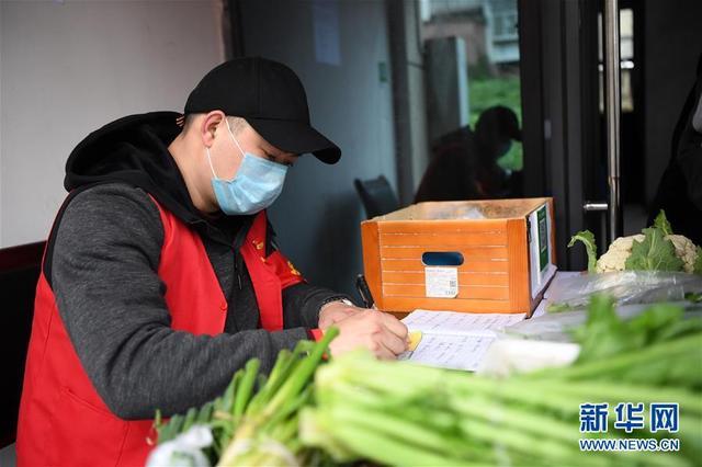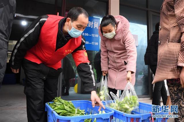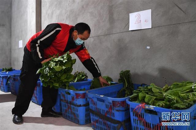 2月6日,社區(qū)志愿者在整理社區(qū)蔬菜自助超市內(nèi)存放的蔬菜。新華社記者 唐奕 攝