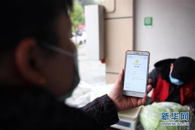 2月6日,當(dāng)?shù)鼐用裨谏鐓^(qū)蔬菜自助超市選購蔬菜后掃碼付款。新華社記者 唐奕 攝