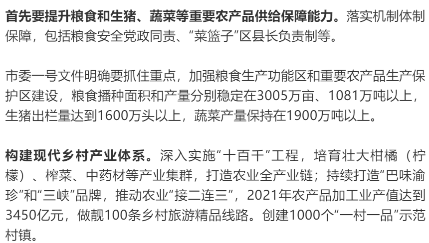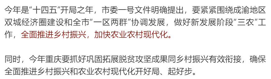 近日,重慶市委、市政府正式發(fā)布《關(guān)于全面推進鄉(xiāng)村振興加快農(nóng)業(yè)農(nóng)村現(xiàn)代化的實施意見》(簡稱市委一號文件),為重慶抓好“三農(nóng)”工作確立了方向、明晰了路徑。