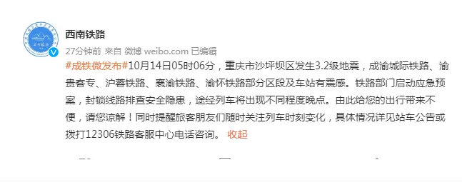 據(jù)@西南鐵路 消息,10月14日05時06分,重慶市沙坪壩區(qū)發(fā)生3.2級地震,成渝城際鐵路、滬蓉鐵路、襄渝鐵路、渝懷鐵路部分區(qū)段及車站有震感。鐵路部門啟動應(yīng)急預(yù)案,封鎖線路排查安全隱患,途經(jīng)列車將出現(xiàn)不同程度晚點。由此給您的出行帶來不便,請您諒解!同時提醒旅客朋友們隨時關(guān)注列車時刻變化,具體情況詳見站車公告或撥打12306鐵路客服中心電話咨詢。