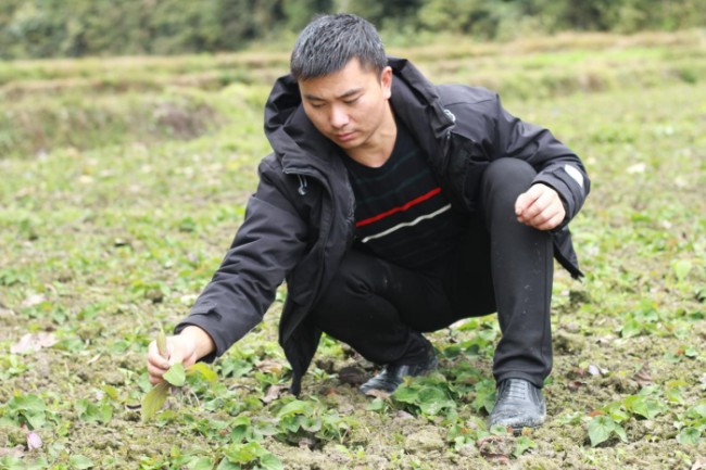 ▲ 冉相在田間察看折耳根長(zhǎng)勢(shì)