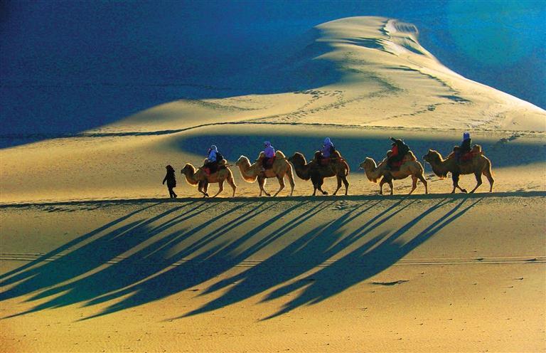 ③甘肅省敦煌市鳴沙山月牙泉景區(qū),游客騎著駱駝欣賞冬日大漠風(fēng)光。隨著旅游市場(chǎng)的全面恢復(fù),景區(qū)迎來(lái)大批游客。張曉亮攝(中經(jīng)視覺(jué))