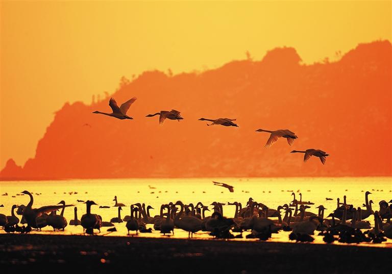 ⑤山東省榮成市天鵝湖畔,大天鵝迎著朝陽(yáng)飛翔。榮成天鵝湖是亞洲最大的天鵝越冬棲息地,每年都有上萬(wàn)只天鵝來(lái)此越冬,成為冬日一大盛景。楊志禮攝(中經(jīng)視覺(jué))