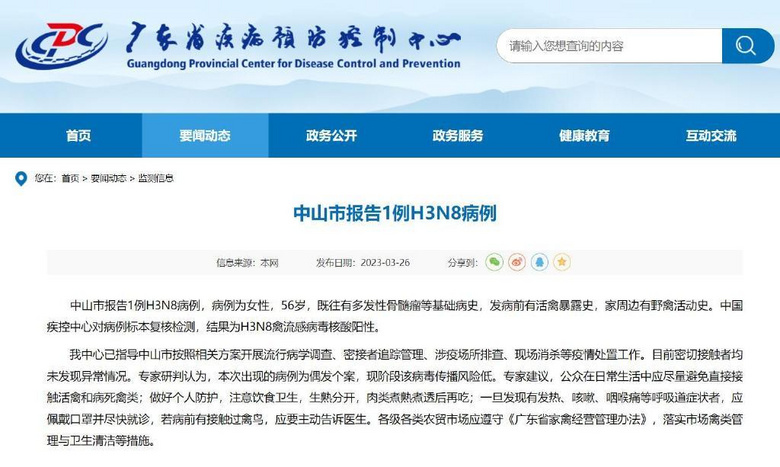 據(jù)廣東省疾病預(yù)防控制中心消息,廣東省中山市報(bào)告1例H3N8病例,病例為女性,56歲,既往有多發(fā)性骨髓瘤等基礎(chǔ)病史,發(fā)病前有活禽暴露史,家周邊有野禽活動(dòng)史。中國(guó)疾控中心對(duì)病例標(biāo)本復(fù)核檢測(cè),結(jié)果為H3N8禽流感病毒核酸陽(yáng)性。