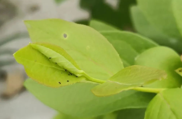 仔細(xì)觀察藍(lán)莓植株,在卷曲葉片內(nèi)或周圍,通常能發(fā)現(xiàn)卷葉蛾幼蟲吐絲形成的白色絲網(wǎng)。另外,葉片上還會(huì)有黑色或褐色小顆粒狀蟲糞。