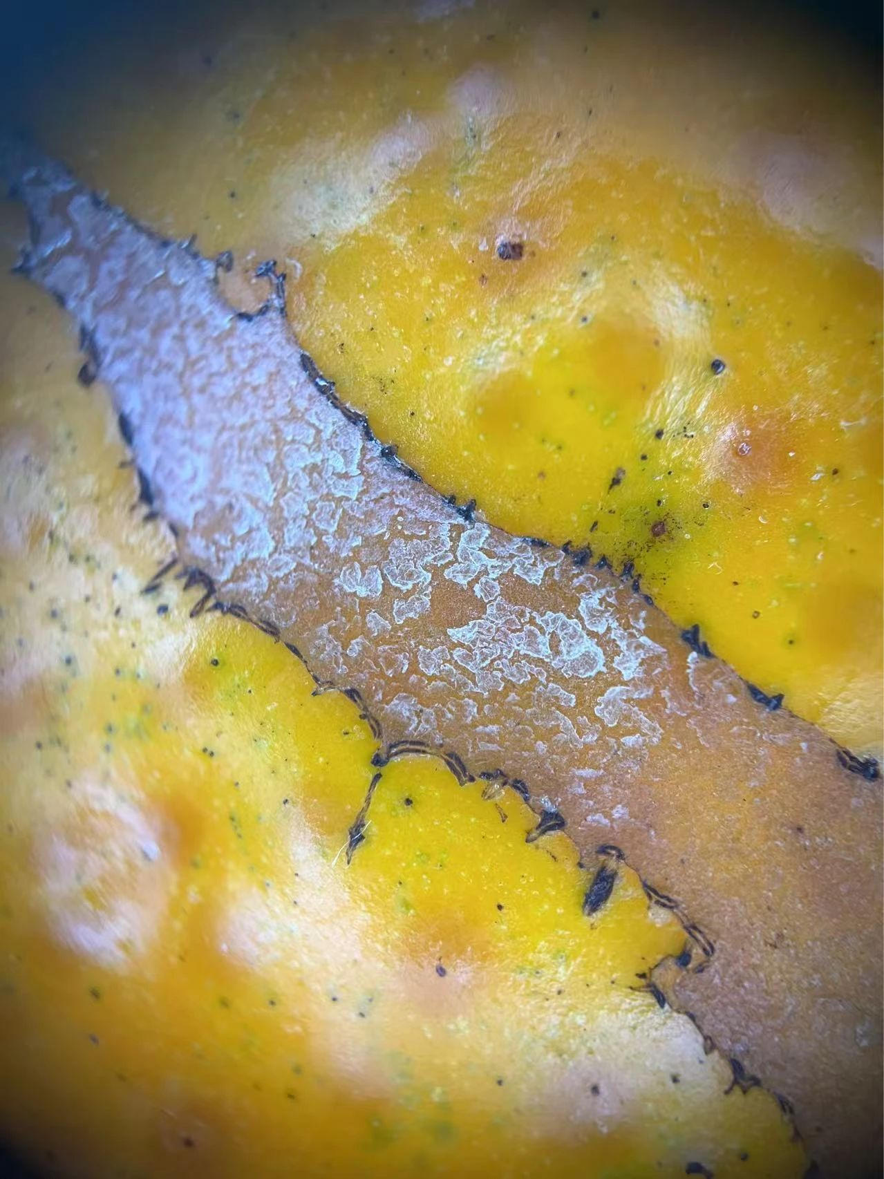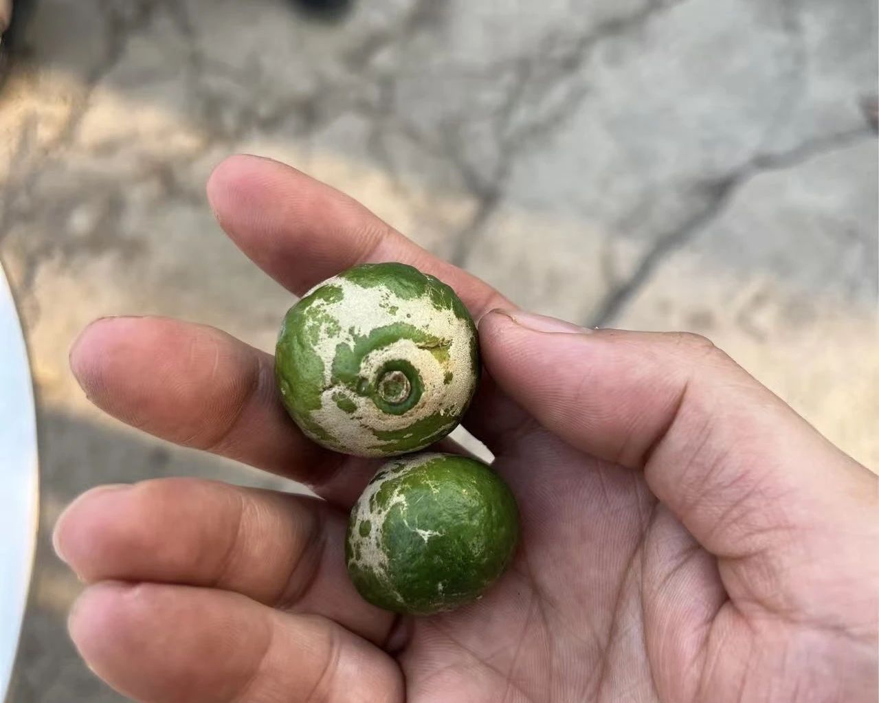 以柑橘在花期間,受到灰霉病害和薊馬蟲(chóng)害后,都能造成果面受損,形成花皮果的現(xiàn)象;幼果期間灰霉病和薊馬為害所形成的花病并不容易區(qū)分,它們?cè)诠麑?shí)膨大后,果面所形成的花斑都不會(huì)因?yàn)楣麑?shí)的膨大和果實(shí)上色成熟而主動(dòng)消失,從而造成果實(shí)商品價(jià)值降低。但與薊馬為害不同,柑橘灰霉病為害所造成的損失主要集中在花期至謝花期間,只要在此期間進(jìn)行防控,就可避免灰霉病害造成的損失。以下是在柑橘采收后果面殘存下來(lái)的灰霉花斑條塊: