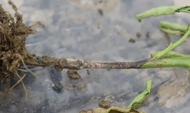 發(fā)病初期,與地面接觸的莖基部皮層出現(xiàn)水浸狀腐爛,葉片自下而上逐漸變黃,嫩芽和嫩葉生長緩慢,色澤暗。有時(shí)癥狀只在一側(cè)發(fā)展,形成條狀壞死區(qū),后期全株枯死。