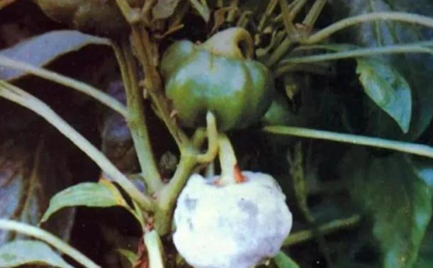 成株期發(fā)。豪苯烦芍昶诎l(fā)病主要危害果實,初期果實上會產(chǎn)生褐色的水浸狀病斑,患病部位會迅速軟化,隨之辣椒整個腐爛。在空氣相對濕度大時患病部位會產(chǎn)生致密的白色霉層,霉層往往包裹整個辣椒果實。