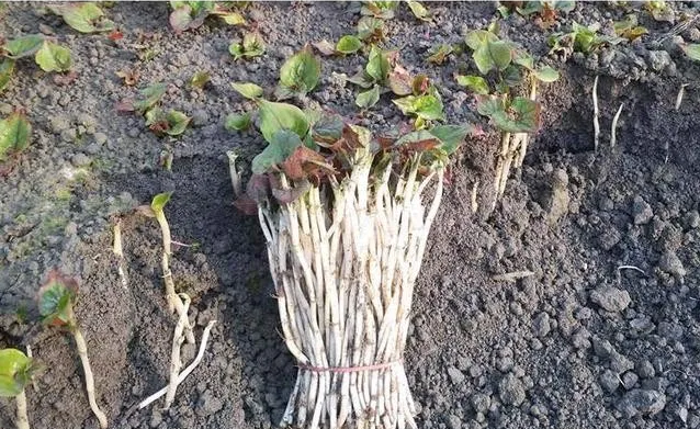 魚腥草種苗繁育一般有兩種方式, 根莖 繁殖和莖稈扦插繁殖。種苗繁育時(shí)間一般在10月上中旬,繁育田選在排灌方便、交通便利、非重茬的沙壤土地塊,每平方米施用木質(zhì)素菌肥100克,46%尿素30克,12%過磷酸鈣150克,整平耙細(xì),做寬1.2米南北向平畦。根莖繁殖,挑選健康不攜帶任何病害、蟲傷的粗壯根莖,剪成5~10厘米長(zhǎng)的小段,每段確保具2~3節(jié),并有3條以上的須根,扦插前用500毫克/千克生根粉溶液蘸根20分鐘,然后按照25厘米行距、5厘米株距栽植在種苗繁育田內(nèi)。土壤相對(duì)濕度維持在70%以上,根莖以上覆土6厘米厚,覆蓋地膜保溫保濕。扦插繁殖,多在6月初進(jìn)行,選擇健壯植株,將其枝條剪成3~4節(jié)的插條,每5個(gè)插條捆扎成一把,將生物發(fā)酵菌液100~150倍液與500毫克/千克萘乙酸溶液混合均勻后,蘸根25~30分鐘,然后以20厘米行距、10厘米株距扦插在育苗畦內(nèi)。畦內(nèi)相對(duì)濕度維持在90%以上,用遮光率60%以上的遮陽網(wǎng)覆蓋,有新葉長(zhǎng)出后,在晴天的下午撤除遮陽網(wǎng)。結(jié)合淺中耕除草,在晴天下午或者陰天葉面噴施生物菌液100~150倍液,一般噴2~3次,可培育壯苗,提高移栽成活率。