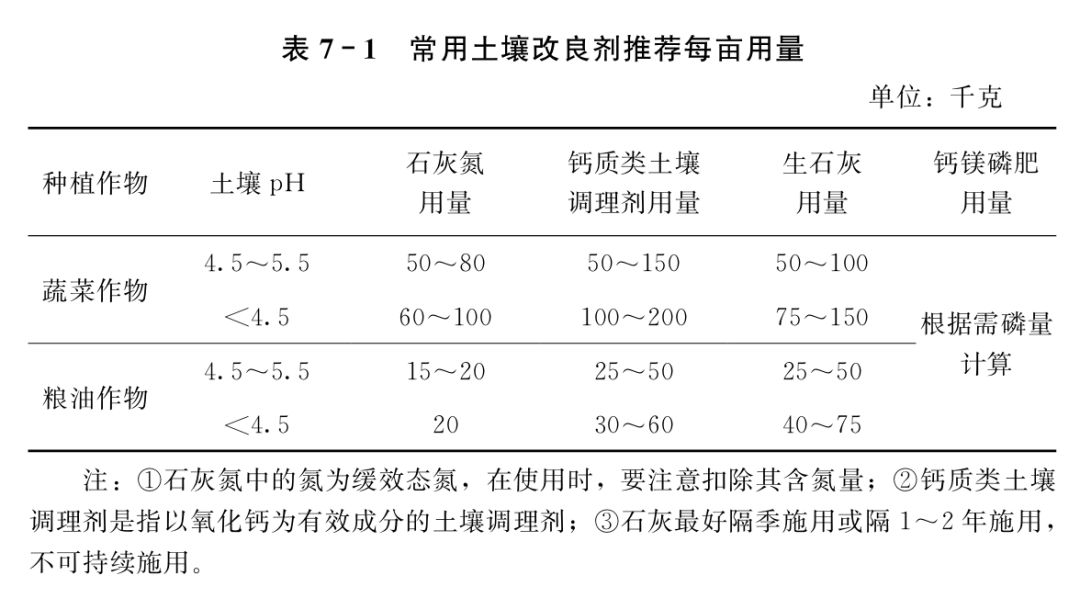當(dāng)土壤pH小于5.5,需施用土壤改良劑,常用的土壤改良劑包括石灰氮、土壤調(diào)理劑、生石灰、鈣鎂磷肥等。石灰氮因具有殺菌和改良土壤的雙重作用,在設(shè)施基地上使用較多,如蔬菜基地、草莓基地等。蔬菜基地和糧油基地常用土壤改良劑用量見表7-1,種植特色經(jīng)濟(jì)作物,土壤施用土壤改良劑的用量可參考蔬菜用量。具體用量根據(jù)土壤pH和作物需求量進(jìn)行調(diào)整。
