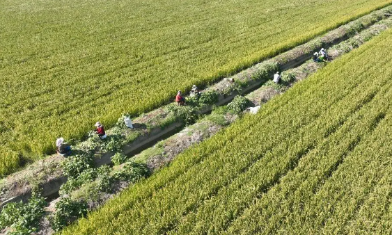 10月9日,在山東省臨邑縣德平鎮(zhèn),農戶在晾曬剛收獲的玉米(無人機照片)。新華社記者 徐速繪 攝為大面積提升單產,山東在全省布局建設了6個單產提升引領區(qū),共安排2.95億元資金,重點推廣玉米單產提升5項打包技術,預計項目區(qū)增產幅度達到10%以上。聚焦旱作地區(qū)提單產,山西省今年在9個市27個縣重點推廣有機旱作集成技術。在翼城縣里砦村的示范田里,用上了集成技術的玉米,每穗籽粒數增加10粒左右。