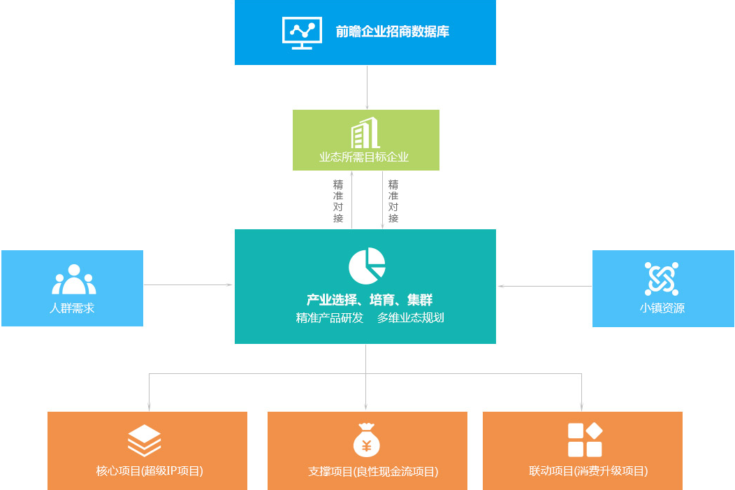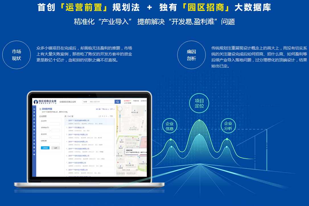前瞻產(chǎn)業(yè)研究院深耕產(chǎn)業(yè)規(guī)劃/園區(qū)規(guī)劃領(lǐng)域15年,深知項(xiàng)目能不能真正盈利,“產(chǎn)業(yè)導(dǎo)入是否精準(zhǔn)、業(yè)態(tài)升級(jí)是否合理、項(xiàng)目招商能否落地”是關(guān)鍵。前瞻依托原有園區(qū)招商前置前瞻性招商難題解決方案作延伸,結(jié)合小鎮(zhèn)項(xiàng)目特點(diǎn),獨(dú)創(chuàng)性確立了特色小鎮(zhèn)“運(yùn)營(yíng)前置”規(guī)劃法。在前期規(guī)劃產(chǎn)業(yè)組合與盈利項(xiàng)目時(shí),便前瞻性調(diào)研鎖定消費(fèi)人群需求,精準(zhǔn)化產(chǎn)業(yè)資源開(kāi)發(fā)與產(chǎn)品設(shè)計(jì),多維度小鎮(zhèn)業(yè)態(tài)打造,再依托前瞻獨(dú)有「園區(qū)招商」大數(shù)據(jù)庫(kù),精準(zhǔn)捕捉小鎮(zhèn)業(yè)態(tài)所需目標(biāo)企業(yè),意向?qū),使市?chǎng)需求、項(xiàng)目規(guī)劃與招商三者無(wú)縫對(duì)接。