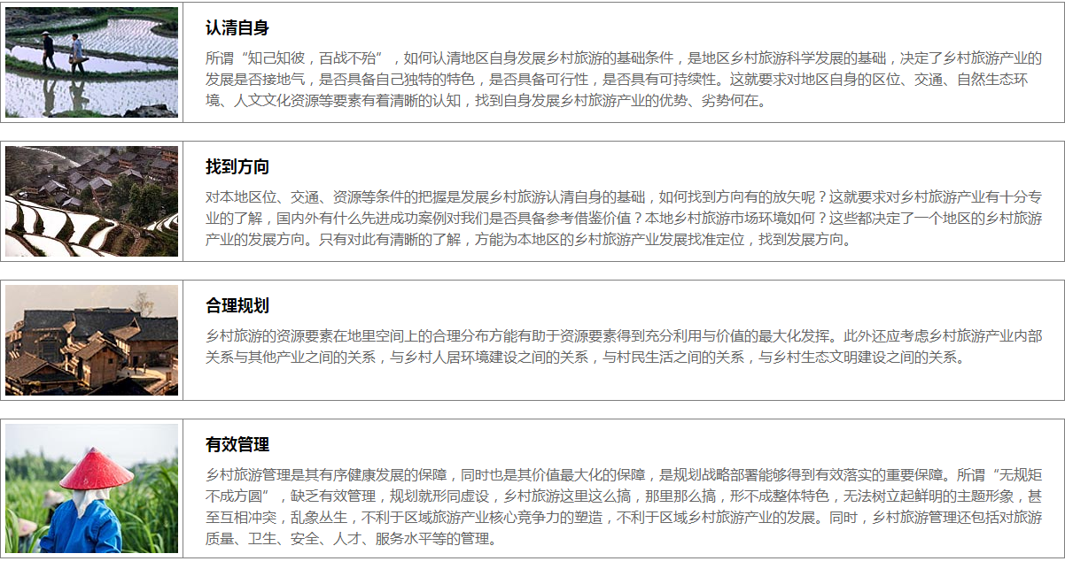 對于村集體而言,與政府面臨的問題類似,也包括“認(rèn)清自身、找到方向、合理規(guī)劃、有效管理、招商合作、投資融資、營銷推介”這幾大方面。不過,村集體發(fā)展鄉(xiāng)村旅游所面臨的問題相對更為具體,它更需要通過對政府政策的研究與利用得到充分支持,更需要對上位規(guī)劃的尊重與有效銜接發(fā)展符合自身特色的鄉(xiāng)村旅游產(chǎn)品,對鄉(xiāng)村旅游產(chǎn)品進(jìn)行創(chuàng)新,同時注意村莊其他產(chǎn)業(yè)的關(guān)系,與村莊建設(shè)的關(guān)系、與村莊生態(tài)文明建設(shè)與村民生活水平提高之間的關(guān)系。