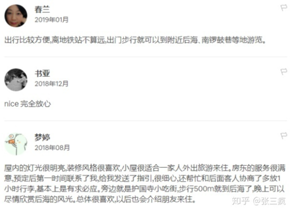 總是要和房東聊聊,也可以看看房東的資料,也可以看看他對房子的介紹。這個呢,一方面可以排除一些你感覺很差的房東,一方面可以發(fā)現(xiàn)有些特別吸引你的房東。當然也有些時候,房東其實挺普通的一個人,大多數(shù)情況可能是這樣的。但是選民宿不就是淘東西一樣么,遇到一個投緣的房東會很不同。有個房東這么說,只要對脾氣,咋滴都成,如果不對脾氣,我還不伺候呢。為什么我把評價沒單獨做個項目,而是放在一起了。這是因為評價在民宿這里其實重要性遠不如其它商品。首先就是交易量不夠,一個房子上線一年,它的交易量在一個平臺能有20單不錯了,評價這件事情沒有基數(shù)就意義不大了,樣本量不夠。當然通過評價可以發(fā)現(xiàn)一些特別容易引發(fā)評價的房子。多數(shù)情況下,沒什么意義。如果一個房子評價數(shù)超高,要么就是房子老了(呵呵);要么就是評論管理的結(jié)果。這個看愛彼迎特別明顯,比如那個房子有三個點評,點點頭像就知道發(fā)言最長的同樣也是個房東。那2個基本是馬甲水軍。