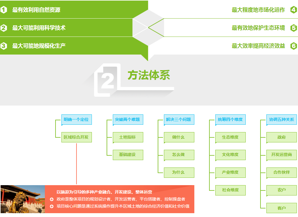 綠維文旅多年來專注于創(chuàng)意休閑農(nóng)業(yè)與鄉(xiāng)村旅游度假領(lǐng)域的創(chuàng)新型研究和鄉(xiāng)村區(qū)域綜合開發(fā)項(xiàng)目的運(yùn)作,致力于以優(yōu)質(zhì)生態(tài)環(huán)境為依托、以大農(nóng)業(yè)資源為基礎(chǔ)、以品質(zhì)鄉(xiāng)村旅游為引導(dǎo)的集“生態(tài)產(chǎn)業(yè)、現(xiàn)代農(nóng)業(yè)、農(nóng)產(chǎn)品DIY加工、鄉(xiāng)村旅游、養(yǎng)生度假、休閑地產(chǎn)、創(chuàng)意文化”為一體的綜合開發(fā)運(yùn)營項(xiàng)目,提供從項(xiàng)目前期策劃規(guī)劃設(shè)計到后期運(yùn)營管理咨詢的全程系列產(chǎn)品服務(wù),實(shí)現(xiàn)“創(chuàng)意經(jīng)典、落地運(yùn)營”的交鑰匙工程。