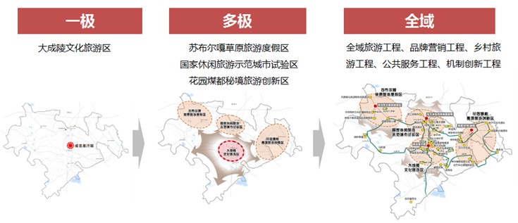 由一極到多極,由1個(gè)成陵到1個(gè)龍頭、3個(gè)重點(diǎn)的“1+3”全域旅游吸引