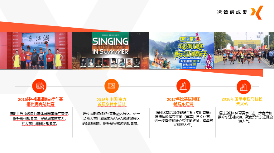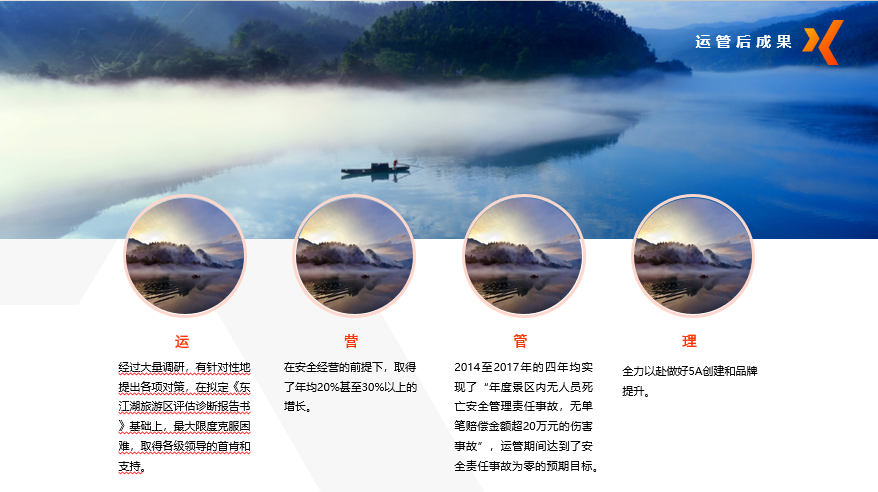 巔峰旅投運(yùn)管后,東江湖于2015年7月20日成功創(chuàng)建為國(guó)家AAAAA級(jí)景區(qū),邁上了超常規(guī)、跨越式發(fā)展道路,取得了卓越的成效,現(xiàn)今正帶領(lǐng)全體員工備戰(zhàn)國(guó)家旅游局5A復(fù)核迎檢工作。