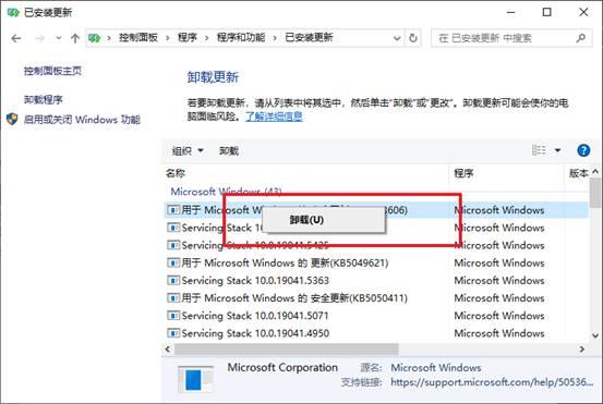 進入 "控制面板" → "程序和功能" → "查看已安裝的更新"。找到最近的 Windows 更新(通常是 KB 開頭的補丁,如 KB5021234)。右鍵點擊 → "卸載",然后重啟電腦。