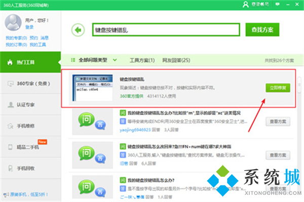2、再查找輸入“鍵盤按鍵錯亂”,然后點(diǎn)擊“查找方案”,在對應(yīng)的方案點(diǎn)擊“立即修復(fù)”即可;