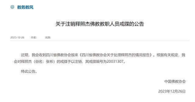 2023年12月26日,中國(guó)佛教協(xié)會(huì)網(wǎng)站發(fā)布《關(guān)于注銷釋照杰佛教教職人員戒牒的公告》稱,“近期,我會(huì)收到四川省佛教協(xié)會(huì)報(bào)來(lái)《四川省佛教協(xié)會(huì)關(guān)于處理釋照杰的情況報(bào)告》。根據(jù)有關(guān)規(guī)定,我會(huì)對(duì)釋照杰(俗名:張彬)的戒牒予以注銷,其戒牒編號(hào)為20031307!