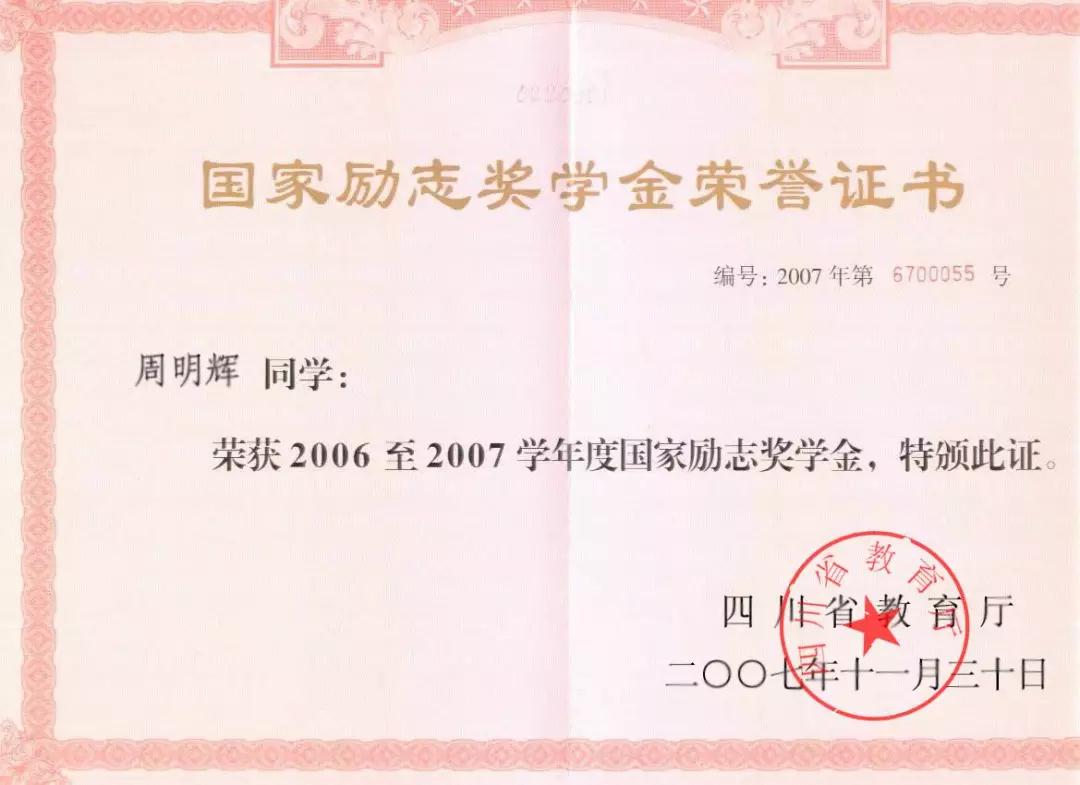 為什么大學(xué)四年只有三年獲得了獎學(xué)金,原因是他大四時開始到企業(yè)實習(xí),重點放在了工作實踐上,所以不再參與獎學(xué)金考評。周明輝所獲十次獎學(xué)金中,分量最重和具有代表性的當(dāng)數(shù)“國家勵志獎學(xué)金”。不用分析原因,僅聽名稱就知這份獎學(xué)金的價值和含金量。