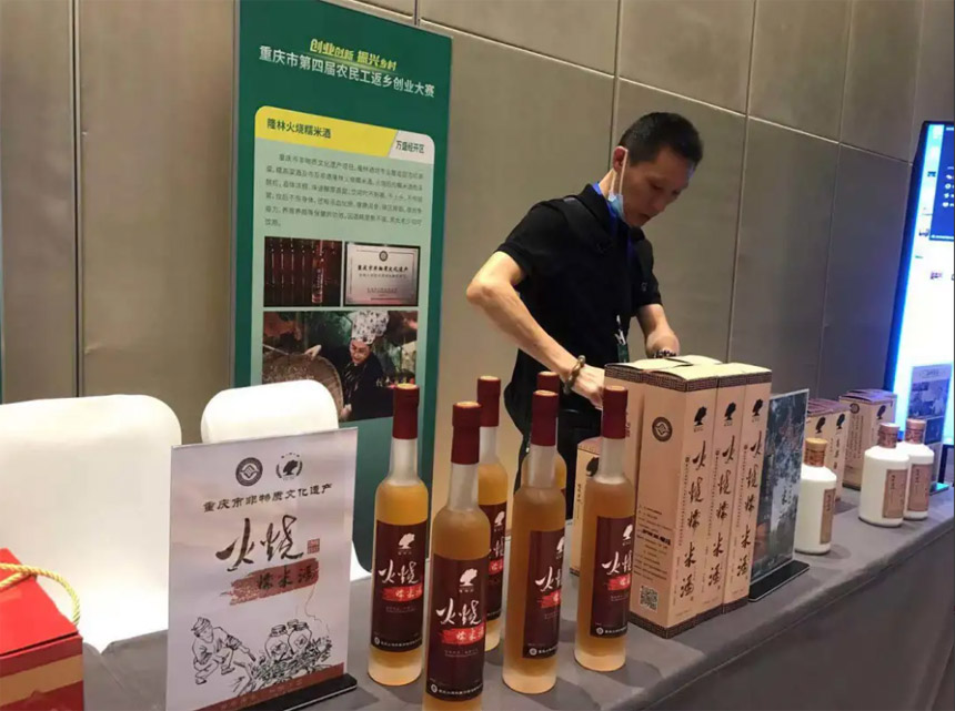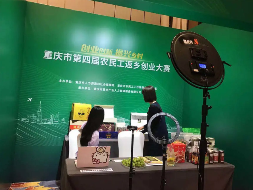 本次大賽同步舉辦返鄉(xiāng)創(chuàng)業(yè)產(chǎn)品展和網(wǎng)絡(luò)直播,共有35個(gè)返鄉(xiāng)創(chuàng)業(yè)企業(yè)帶來的優(yōu)質(zhì)產(chǎn)品在現(xiàn)場和直播間里進(jìn)行展示。