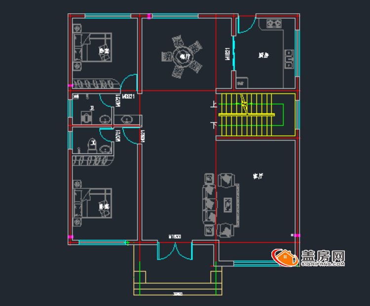 一層入戶既客廳,非常寬敞。西側(cè)有兩間臥室,南北各一間,南向臥室內(nèi)設(shè)獨(dú)衛(wèi),作為老人房最為合適。餐廚區(qū)在一層的北側(cè),廚房有后門可直通室外。