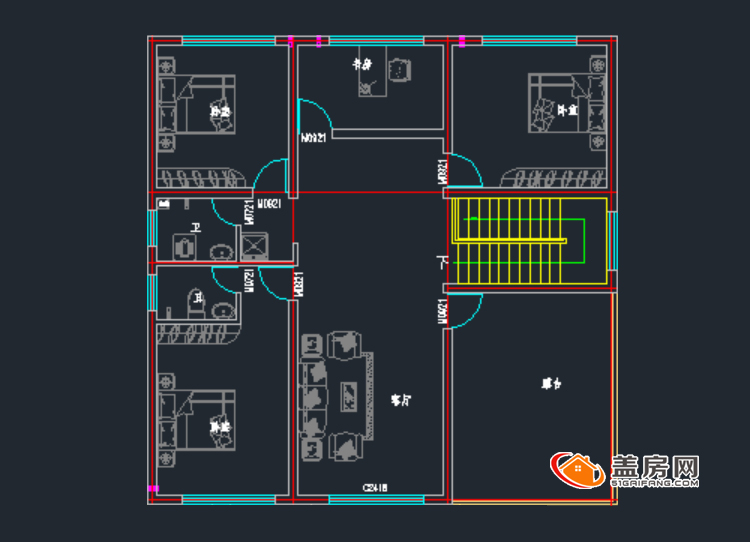 二層的臥室比較多,共有四間,分布在四角,朝南的兩間臥室均設(shè)有內(nèi)衛(wèi)。中間是一個(gè)起居室,起居室的北側(cè)隔了一間書房給孩子寫作業(yè)用。