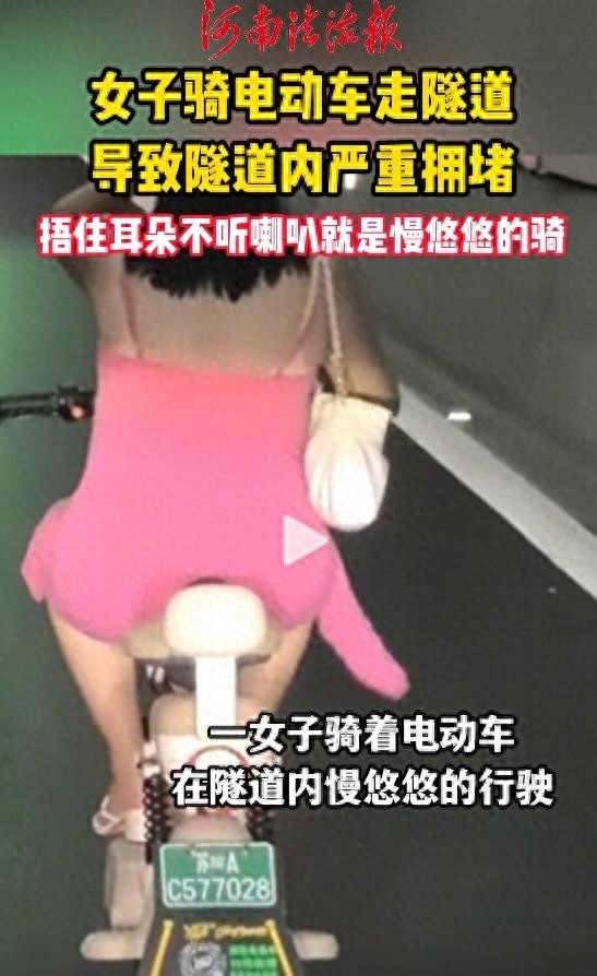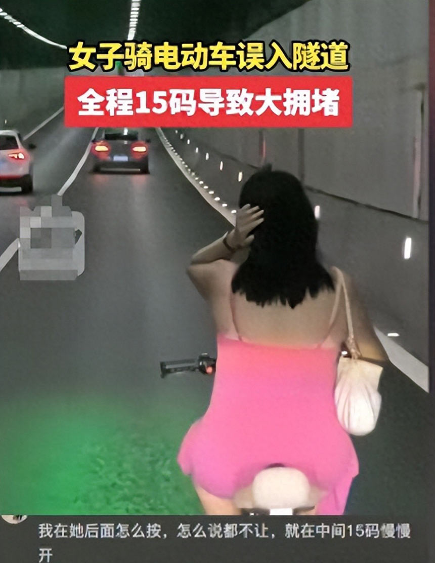 8月31號傍晚南京揚子江隧道堵車了。一個穿粉色裙子女人騎電動車在隧道里騎得特別慢,只有15碼。隧道限速70碼,她占著右邊車道不讓后面車走,堵了兩公里。有人拍視頻說她捂耳朵裝聽不見鳴笛,后來查出她當(dāng)天還去過兩個別的過江隧道,故意在路上磨蹭。