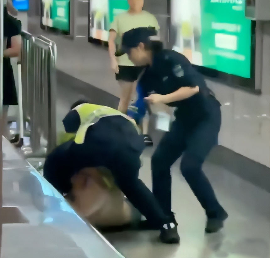 一旁的男安檢員看到同事也被打,于是想著這樣下去也不是辦法,于是當(dāng)女子再次掄起背包的時候,將女子按倒在地。