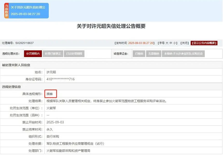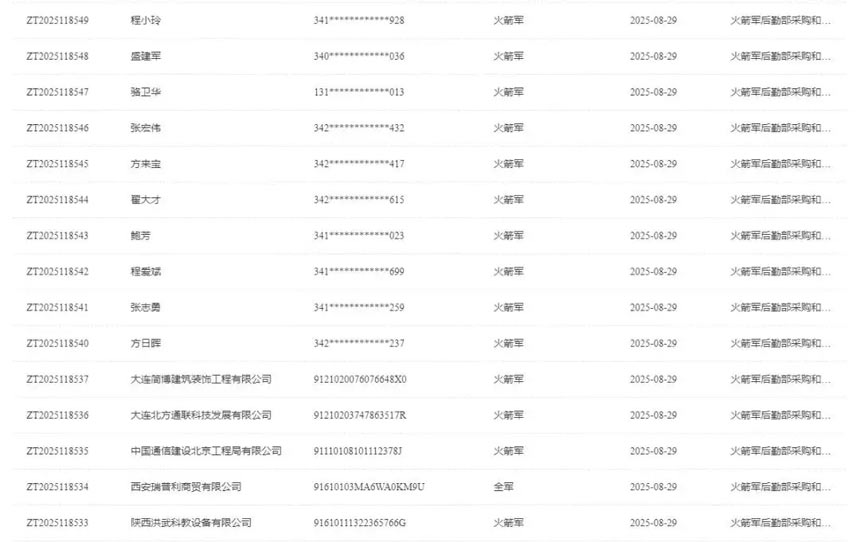 8月28日至9月1日,火箭軍后勤部采購(gòu)和資產(chǎn)管理局發(fā)布180條公告,宣布終止74位評(píng)標(biāo)專(zhuān)家和116家供應(yīng)商的資格。這些供應(yīng)商被停止參與投標(biāo)軍隊(duì)采購(gòu)項(xiàng)目的權(quán)利,評(píng)標(biāo)專(zhuān)家則失去參與軍隊(duì)項(xiàng)目評(píng)審的資格。