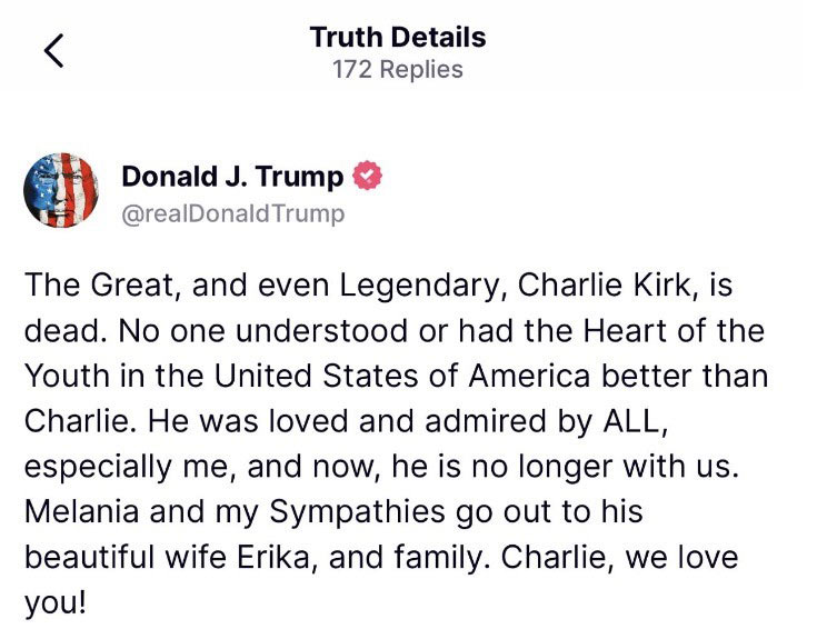 “偉大的,甚至是傳奇的查理·柯克,死了。沒有人比查理更了解美國青年的心。他深受愛戴和敬佩,尤其是我。梅拉尼婭和我向他美麗的妻子埃里卡和家人致以最深切的慰問。查理,我們愛你!”
