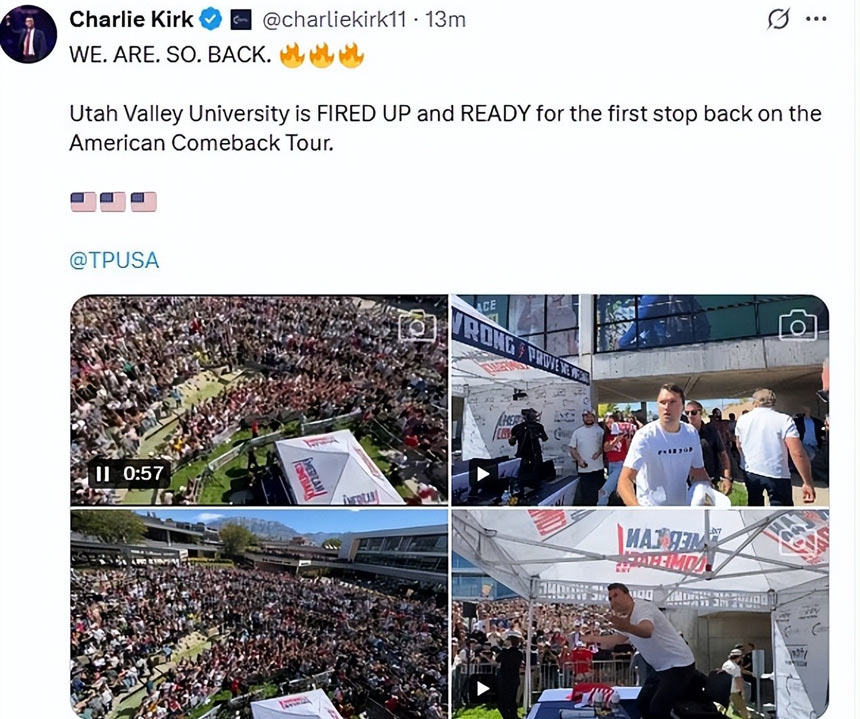諷刺的是,就在槍擊發(fā)生前幾分鐘,柯克還在X平臺上興奮發(fā)文:“我們。真的。回來了。猶他谷大學(xué)已經(jīng)蓄勢待發(fā),準備好迎接美國復(fù)出之旅的第一站。”