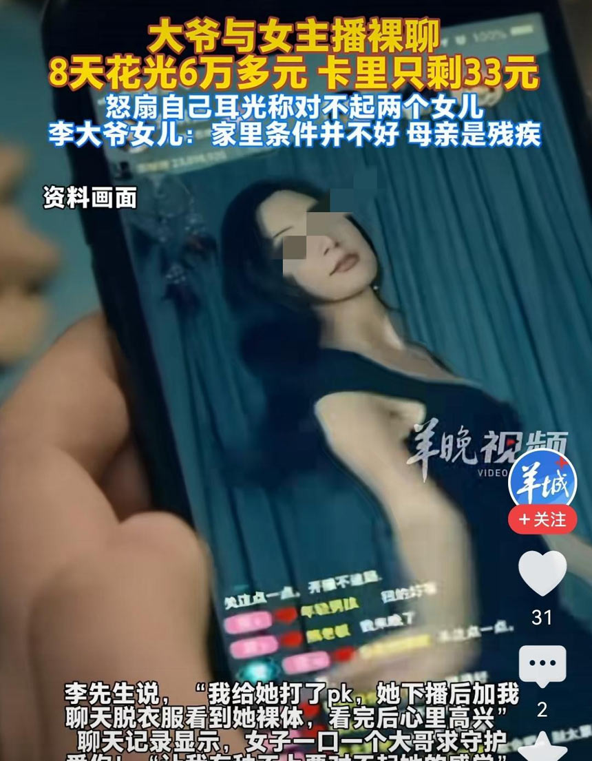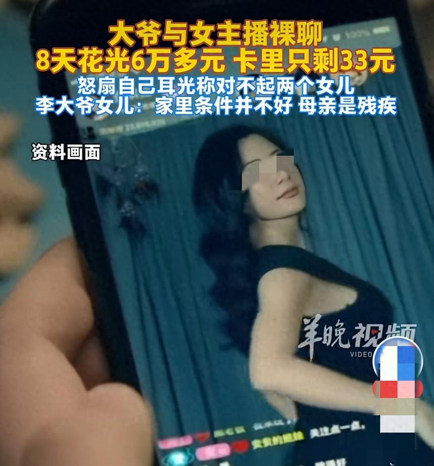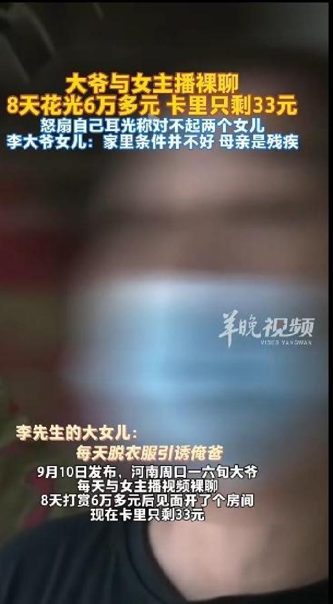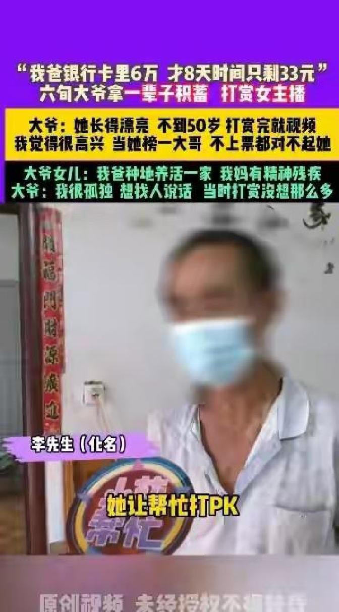 河南周口,一個60歲的李大爺,靠種地為生,家里還有個患精神病的妻子。就是這么一個典型的、老實巴交的中國農(nóng)民,在8天時間里,給一個女主播刷了6萬塊,卡里最后只剩下33塊。