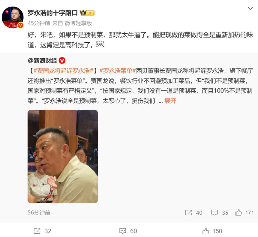9月11日下午,羅永浩在微博發(fā)文回應(yīng)稱:“好,來吧。能把現(xiàn)做的菜做得全是重新加熱的味道,這肯定是高科技了!