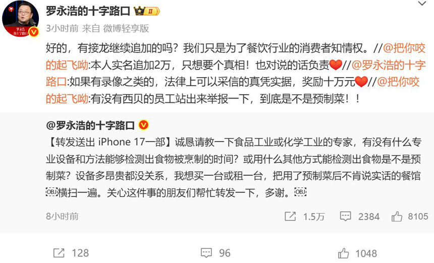 隨后,他還發(fā)布10萬元懸賞,公開征集西貝使用預(yù)制菜的“真憑實(shí)據(jù)”。