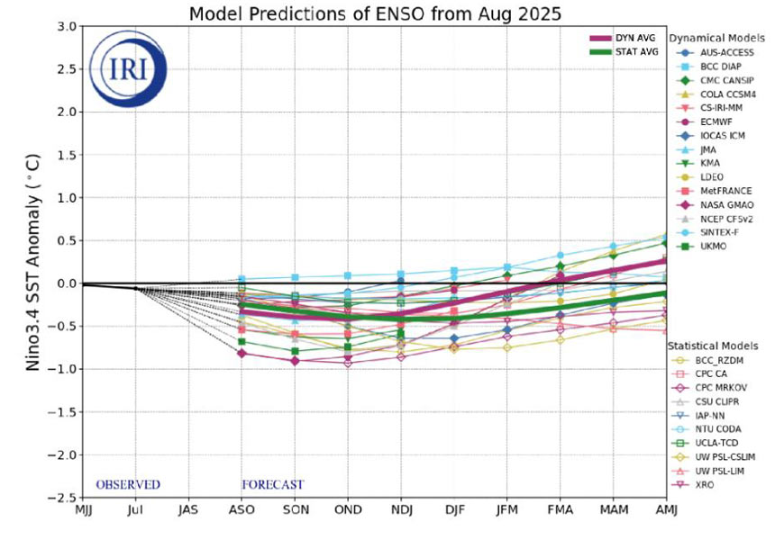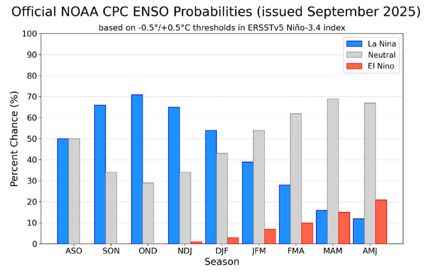 NOAA給出了未來幾個月內(nèi),ENSO中性可能會轉(zhuǎn)變?yōu)長a Niña,10月至12月2025年期間La Niña發(fā)生的概率為71%,看到?jīng)]?概率高達71%,,這說明什么?