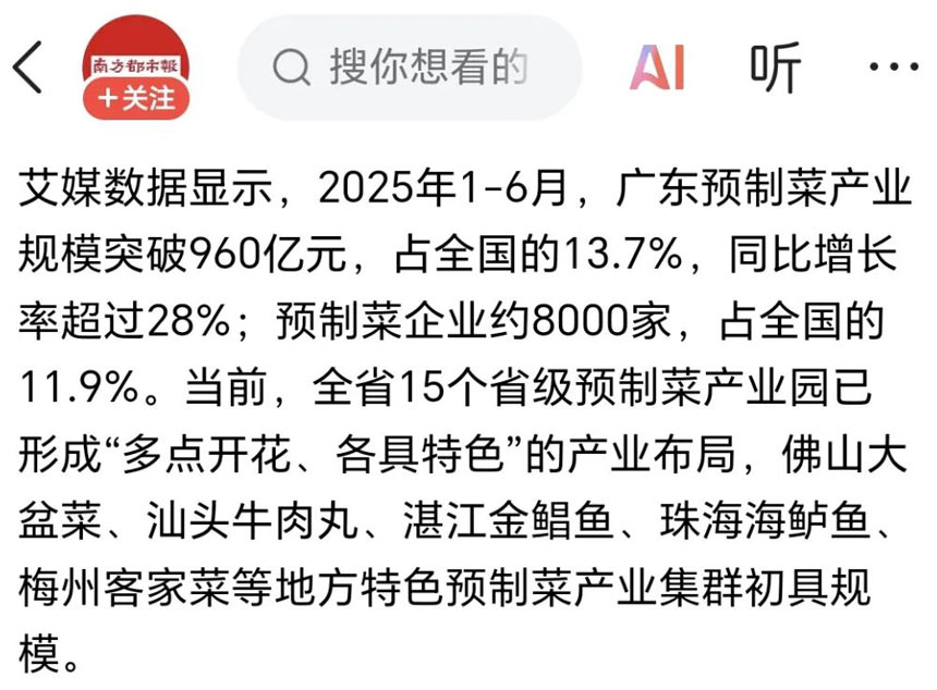 到2025年6月,僅廣東地區(qū),預(yù)制菜產(chǎn)業(yè)規(guī)模就突破960億元,占全國的13.7%,同比增長率超過28%;預(yù)制菜企業(yè)約8000家,占全國的11.9%。