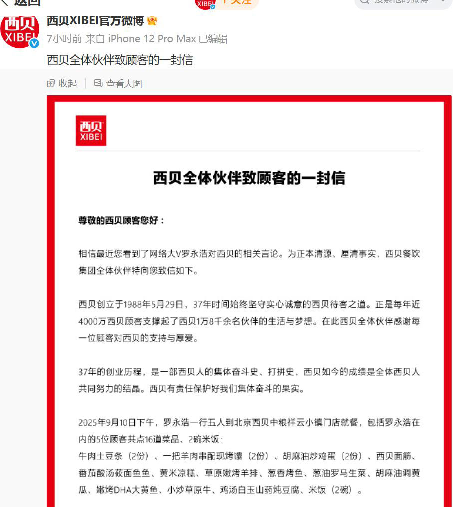 9月12日,西貝發(fā)布致顧客的一封信,稱(chēng)羅永浩在微博中對(duì)西貝的指責(zé)不實(shí),并決定向全社會(huì)開(kāi)放后廚參觀,還將陸續(xù)開(kāi)放原產(chǎn)地、央廚工廠等西貝產(chǎn)地源頭。