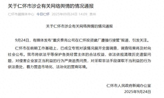 9月24日下午2:09,仁懷市政府新聞辦公室發(fā)布情況通報稱,仁懷市在前期工作基礎上,已成立專班對該情況展開全面調查,調查結果將及時向社會公布。
