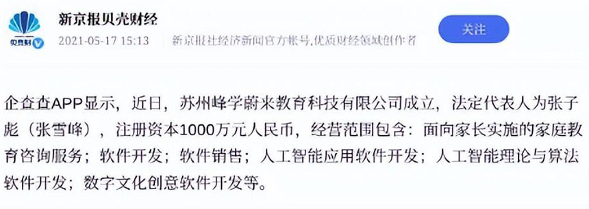 2021年累積了更高人氣的張雪峰舉家搬遷到蘇州,并創(chuàng)立了自己的教育科技新公司,初始注冊資本就高達1000萬。