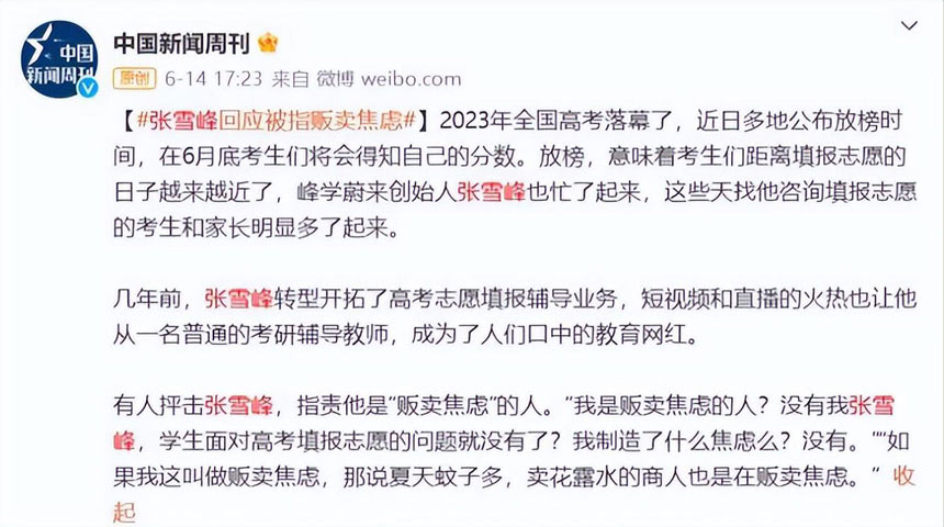 在高考結束后,張雪峰接受了中國新聞周刊的采訪,回應被指責販賣焦慮。